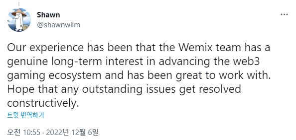 Artichoke Capital의 설립자 숀 림은 "위믹스팀은 웹3 게임 생태계 발전에 장기적인 관점을 가지고 있다"라고 강조하면서 "문제가 건설적으로 해결되기 바란다"라고 밝혔으며, Dispersion Capital 또한 "위믹스를 둘러싼 일들이 잘 마무리되길 희망한다"라고 전했다.