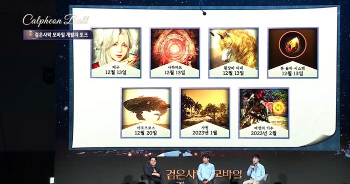 2022 칼페온 연회에서는 검은사막 모바일의 첫 오리지널 캐릭터인 '매구'에 대한 자세한 정보를 공개하는 한편, 대사막 신규 콘텐츠로 '사하자드' 및 '대사막 무법지대', '환상마 디네', 필드 보스 '아포크로스' 등을 선보여 관심을 모았다. 또한 신규 가문 콘텐츠인 '여명의 기수'를 공개하면서 이용자들의 호응을 이끌어냈다.