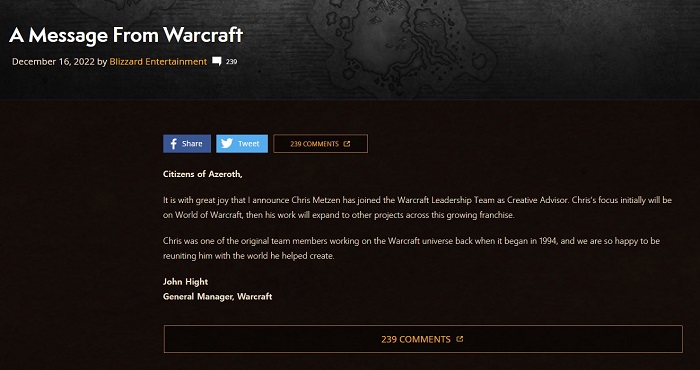 한국 시간으로 16일 오전 4시, 워크래프트 프랜차이즈의 총괄 프로듀서로 일하고 있는 존 하이트(John Hight)가 월드 오브 워크래프트 공식 포럼과 페이스북, 트위터 등 SNS 채널을 통해 워크래프트 리더십 팀의 크리에이티브 어드바이저 역할로 '크리스 멧젠'이 합류한다는 소식을 밝힌 것이다.
