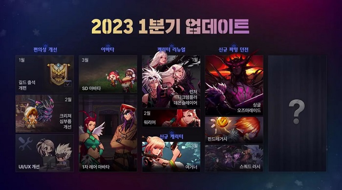 2023년 1분기에는 크게 편의성 개선, 아바타, 캐릭터 리뉴얼, 신규 캐릭터, 신규 파밍 던전으로 분류된다.