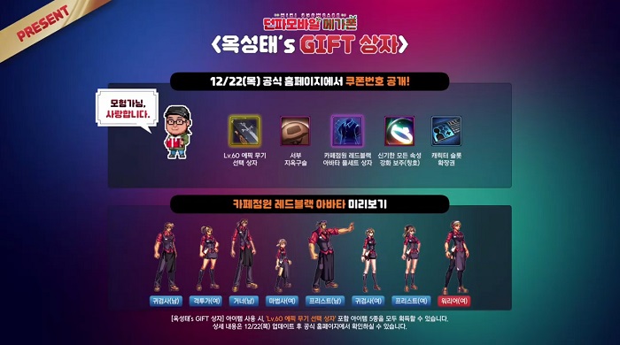 한편, 넥슨은 22일 공식 홈페이지를 통해 '옥성태's GIFT 상자'와 '겨울 눈사람 아바타' 쿠폰번호, 60제 에픽 선택 상자 쿠폰번호를 공개할 예정이다. 옥성태's GIFT 상자에서는 60레벨 에픽 무기 선택 상자와 서부 지옥구슬, 카페점원 아바타 풀셋, 신기한 모든 속성 강화 보주, 캐릭터 슬롯 확장권을 제공하며, 겨울 눈사람 아바타 쿠폰에서는 아바타 뿐만 아니라 눈꽃 크리처와 오라를 추가로 획득할 수 있다.