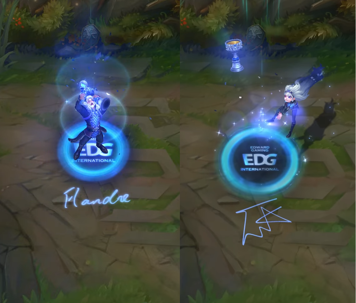 그 밖에도 플랑드레 선수에게 헌정된 EDG 그레이브즈 우승 스킨의 경우 귀환 모션에서 선수가 가장 좋아하는 걸그룹 '(여자)아이들'의 팬덤 전용 응원도구 '네버봉'이 등장하고, EDG 조이 우승 스킨의 경우 스카웃 선수가 4번의 롤드컵 출전 끝에 우승을 거머쥔 것을 귀환 모션에서 4번의 시도 끝에 소환사의 컵을 거머쥐는 것으로 은유하는 등 선수 개개인의 면모나 행적을 알면 더욱 재미있게 즐길만한 요소가 많이 있습니다.