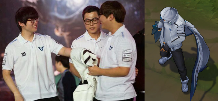 그런데 거꾸로 챔피언이 선수 그 자체가 되어버린 사례가 있습니다. 바로 2014년 우승한 스킨인 '삼성 갤럭시 화이트 트위치'입니다. 사실 삼성 갤럭시 화이트의 우승 스킨은 트위치 외에도 비하인드 스토리가 숨겨져 있는 캐릭터가 둘이나 더 있는데요.