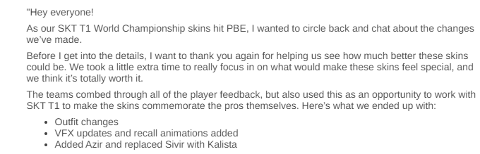 당시 PBE 공지 내용, 전반적인 퀄리티 개선과 아지르, 칼리스타 스킨 추가를 이야기하고 있습니다.