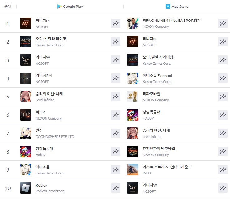 구글 플레이스토어 9위, 애플 앱스토어 4위에 오른 에버소울 = 모바일 인덱스 갈무리