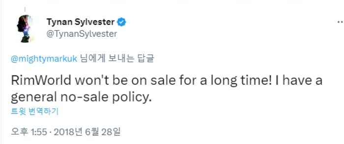 림월드의 할인율이 이렇게 낮은 이유는 개발자 타이난의 의지 때문입니다. 타이난은 림월드 정식 출시 무렵 오랫동안 할인을 하지 않을 거라고 밝혔고, 실제로도 첫 할인까지 2년의 시간이 걸렸습니다. 또한 유저 커뮤니티에 절대 할인하지 않을 거란 말을 하진 않았으며, 그럴 계획은 없다고는 말했지만 언젠간 할인하게 될 것이라고 말한 바 있습니다.