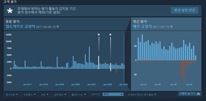 스팀 평가는 무려 97% 긍정적 평가로 압도적으로 긍정적을 기록 중이지만, 최근 게임사가 인플레이션으로 가격을 30달러에서 35달러로 상향해 부정적 평가를 받고 있습니다.
