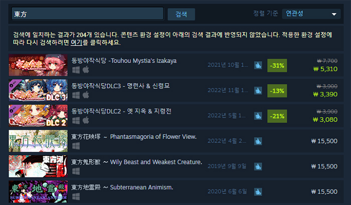 동방 프로젝트는 일본 동인 행사를 통해 판매됐지만, 최근에는 2007년 출시되었던 동방풍신록 이후 작품들이 스팀에 하나둘씩 등록되고 있습니다. 다만, 동시기에 나왔던 2차 창작 게임들과 다르게 아직까지 큰 할인 없이 정가를 유지하고 있습니다.