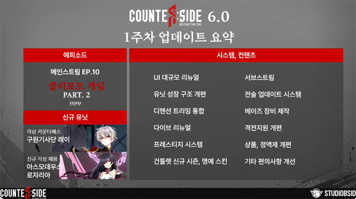이관 후 카운터사이드는 6.0 버전으로 바뀌며, 현재 버전인 5.4에서 한 단계 올라가는 만큼 대규모 업데이트가 진행된다. 6.0의 핵심 키워드는 개혁과 간소화로 낡고 복잡한 시스템을 개혁, 핵심 플레이에 집중할 예정이다.