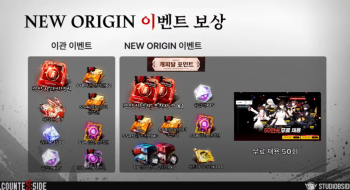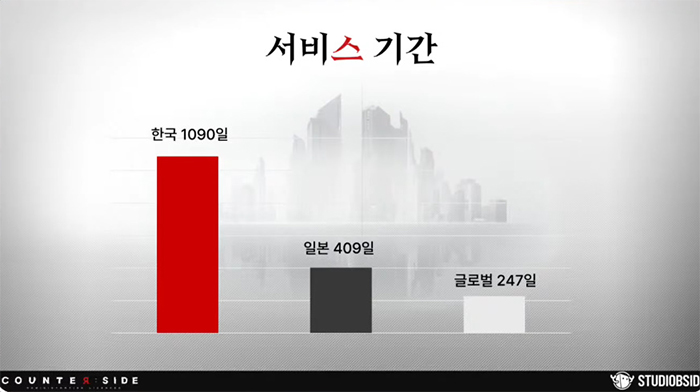 이어서 카운터사이드 박상연 PD가 무대에 등장해 카운터사이드 운영에 대한 발표를 진행했다. 카운터사이드는 한국을 시작으로 일본, 글로벌 3개 서버가 운영되고 있으며, 한국은 1,090일 동안 서비스 중이다. 100레벨을 달성한 유저는 2,374명이며, 90레벨 이상 달성 유저는 5,280명, 챌린저 달성 유저는 1,089명이다.