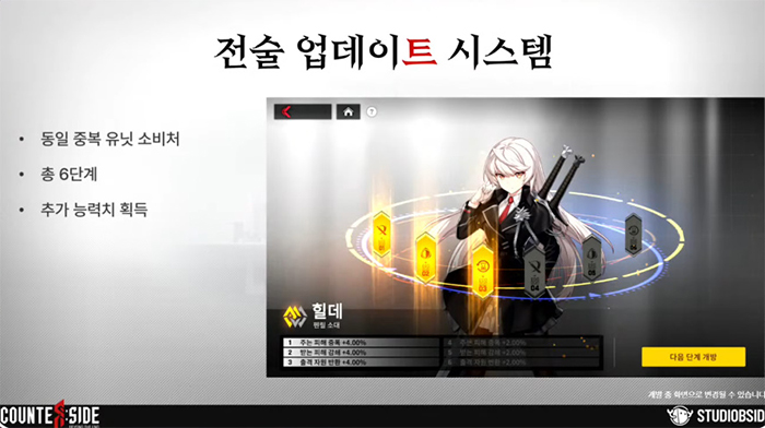 그동안 카운터사이드는 복잡하다는 의견을 많이 받아왔다. 6.0부터는 이러한 부분을 해결해나갈 예정이다. 우선 중복 유닛 관리를 조금 더 편한 방식으로 바꿀 예정이다. 한계 초월과 융합 시 중복 유닛 소비가 삭제되어 아이템으로만 가능하게 바뀐다. 재무장에도 인물 데이터 소비가 사라진다. 카운터패스 동일 유닛 보상은 융합핵 60개로 변경된다. 재무장에 사용된 인물데이터는 태스크 포인트로 한도 내에서 환급해 줄 예정이다. 중복 유닛의 소비처로는 총 6단계로 추가 능력치를 획득하는 전술 업데이트 시스템이 추가된다.