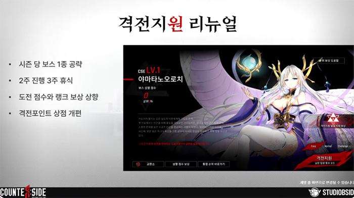 격전지원은 시즌 당 보스 1종을 공략하는 방식으로 바뀌며, 2주 동안 진행, 3주 휴식으로 스케쥴이 진행된다. 도전 점수와 랭크 보상이 상향되며, 격전포인트 상점이 개편된다.