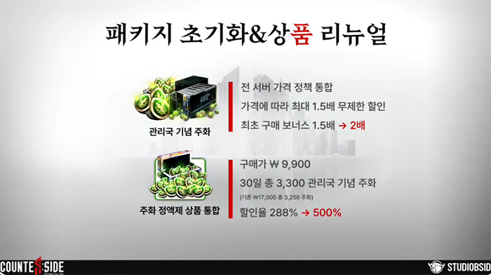 패키지는 초기화되며, 상품도 리뉴얼된다. 비슷한 패키지가 너무 많아 이를 정리한다. 지역이 통합되는 만큼 가격에 따라 최대 1.5배 무제한 할인이 들어가며, 최초 구매 보너스는 2배로 증가한다. 주화 정액제 상품은 9,900원으로 할인율은 500%로 증가해 30일 동안 총 3,300 관리국 기념 주화를 지급한다.