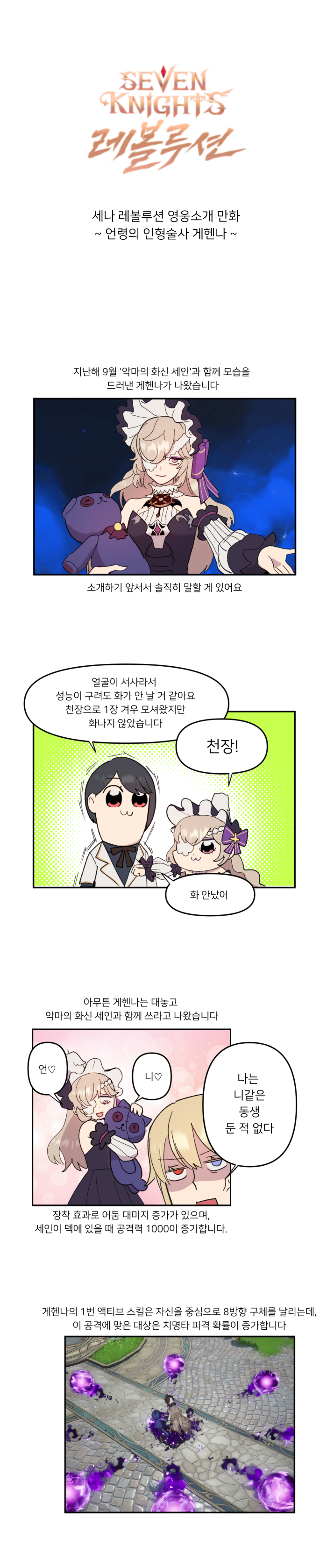 본편에서는 게헨나의 특징과 더불어 게헨나의 암시에 걸린 계승자의 에피소드를 유쾌하게 풀어내고 있다. 세븐나이츠 레볼루션 웹툰 '세나 레볼루션 영웅 소개 만화'는 공식 포럼 세븐나이츠 레볼루션 매거진이나 게임조선에서 확인할 수 있다.