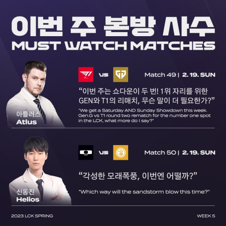 글로벌 해설 위원인 '아틀러스(Atlus)' 맥스 앤더슨(Max Anderson)은 T1과 젠지의 대결에 주목했다. 앤더슨은 "이번 주는 쇼다운이 두 번 펼쳐진다"라면서 "1위 자리를 놓고 대결하는 젠지와 T1의 대결에 무슨 말이 더 필요한가"라며 추천했다. '헬리오스' 신동진 해설 위원은 19일(일) 열리는 디플러스 기아와 리브 샌드박스의 대결을 추천하면서 "각성한 모래 폭풍이 이번에는 디플러스 기아를 넘을 수 있을지 관심이 모인다"라고 말했다.(
