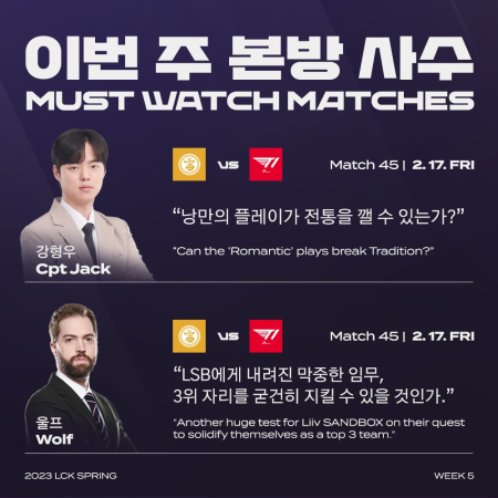 이번 5주차 일정은 T1이 정규 리그 1위를 공고히 할 수 있는 기회이다. T1은 17일(금) 정규 리그 3위인 리브 샌드박스를 상대하고 19일(일) 1위 경합을 벌였던 젠지와 대결을 펼친다.