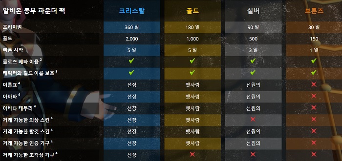 파운더팩은 '크리스탈/ 골드/ 실버/ 브론즈' 등 4개의 상품으로 구성돼 있으며, 이중 가장 큰 혜택을 제공하는 것은 크리스탈 파운더팩이다. 크리스탈 파운더팩을 구매할 경우 프리미엄 서비스 360일과 골드 2,000, 신규 서버에서 기존 서버의 캐릭터 및 길드명 보호, 파운더팩 전용 이름표 및 아바타, 거래 가능한 스킨, 가구 등의 헤택을 받는 것이 가능하다.