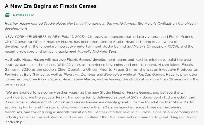 테이크투 인터랙티브는 공식 홈페이지를 통해 '파이락시스 게임즈의 새로운 시대가 시작된다(A New Era Begins at Firaxis Games)'라는 글을 통해 인사이동과 신작 개발에 대해 밝혔다. 파이락시스 게임즈의 COO인 헤더 하젠(Heather Hazen)이 스튜디오 책임자로 승진했으며, 에드 비치(Ed Beach)가 향후 문명 크리에이티브 디렉터로서 역할을 계속하게 될 것으로 밝혔다.