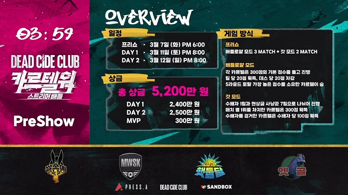 3월 11일과 12일 개최되는 스트리머 배틀 '카르텔워' 본 대회에서는 총상금 5,200만원을 놓고 유명 스트리머 24명이 총 8개 팀으로 나뉘어 승부를 겨루게 된다.