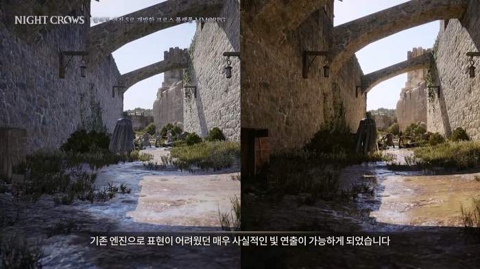 성벽 길에 그늘진 부분과 햇볕이 내리쬐는 부분을 확실하게 구분하고 수면 위의 일렁임까지 표현하는 등 기존 엔진으로 표현이 어려웠던 매우 사실적인 빛 연출까지 세세하게 표현해 나이트 크로우가 추구하는 하이 퀄리티 그래픽 비주얼을 완성했다.