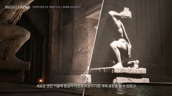 개체 표현도 언리얼 엔진 5의 신기술이 적극 도입됐다. 수백만 개의 폴리곤을 눈에 띄는 퀄리티 손실 없이 자연스럽게 프레임으로 전환하는 '나나이트' 기술을 통해 이전과 차원이 다른 개체 표현을 선보인다. 울퉁불퉁한 석상 벽, 최적화를 위해 조금은 포기해야 하는 세심한 질감까지도 놓치지 않고 구현해 나이트 크로우의 세계를 한층 더 실사적으로 구현했다.