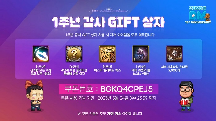 한편, 넥슨은 1주년 기념 GIFT 쿠폰을 공개했으며, 신규 캐릭터 거너(여) 업데이트와 함께 슈퍼 성장 하이 웨이를 진행할 것이라 밝혔다. 던파 모바일의 콘텐츠를 압축해서 성장할 수 있도록 구성돼 있으며, 참여 시 오즈마 레이드 입문 모드에 바로 도전할 수 있는 스펙이 갖춰지는 구성이다. 또한, 1주년 기념 출석 이벤트로 신규 출시되는 '몬스터 코스프래 아바타'의 한정 컬러 버전을 제공한다.