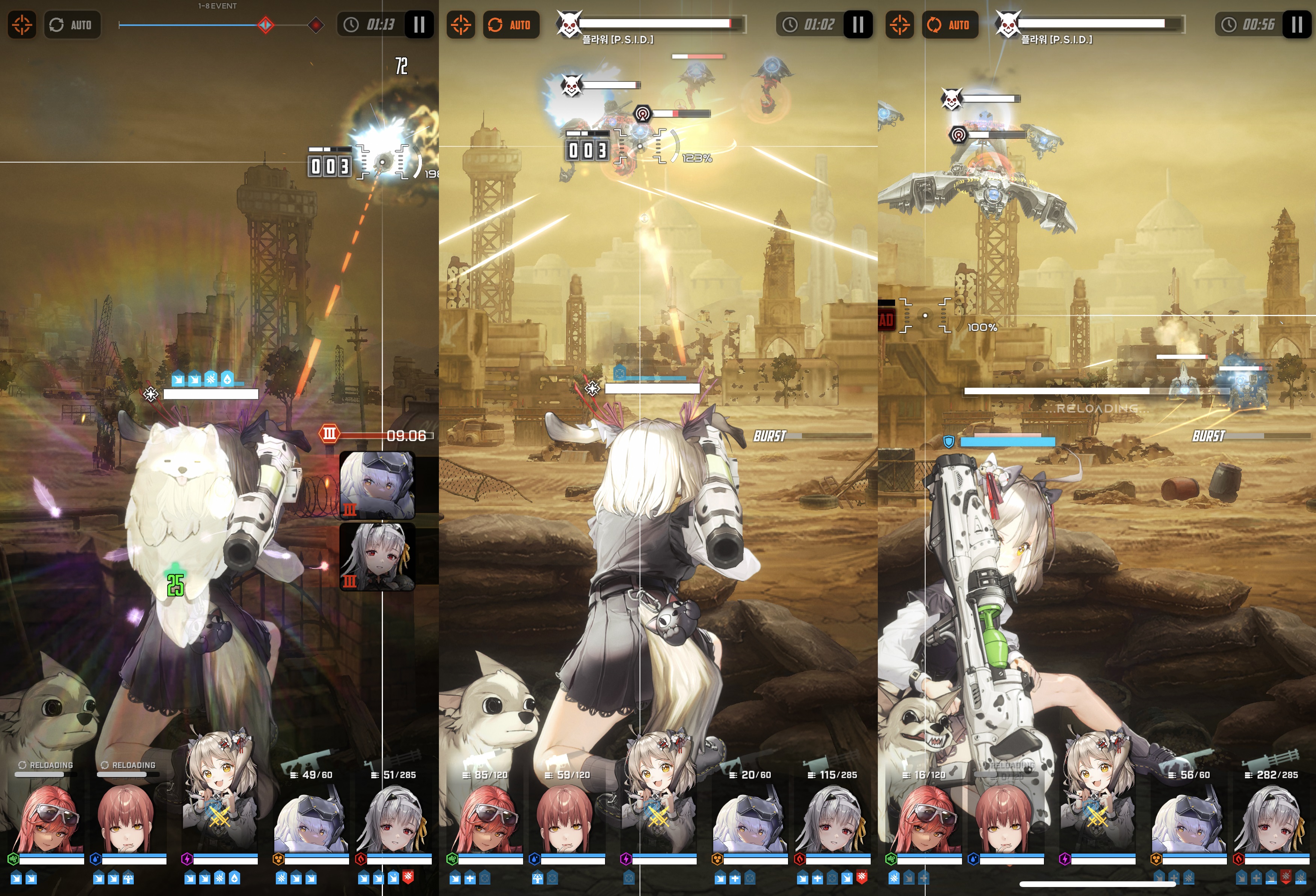 2단계 버스트 스킬인 '산책 훈련'은 엄폐물 부활이라는 유일무이한 효과를 제공한다. 버스트 발동 시 엄폐물이 파괴된 아군 무작위 2명의 캐릭터의 엄폐물을 부활시켜줌과 동시에 지원형 아군 캐릭터 전체에거 공격력 증가 및 공격 대미지 비례 회복이 이뤄지도록 한다.