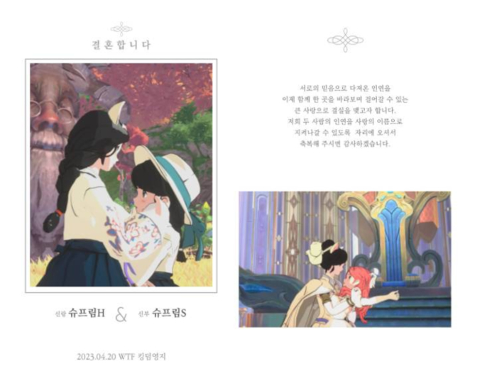 슈프림S: 네, 제2의 나라에 많은 커플들이 계시겠지만 저희처럼 연애부터 결혼까지 모든 순간을 게임과 같이 하신 커플은 드물지 않을까 싶어요. 서버 오픈 채팅방에서 처음 알게 되었고, 수다 떨다 보니 어느 순간 게임보다 이 남자한테 더 관심이 가더라고요. 처음 서버 이전하는 날 게임에서 안 보게 되면 정말 놓칠까 봐 용기 내서 만나자고 했고 그 뒤로도 계속 제 옆에 있는 남자가 되어 주었습니다.
