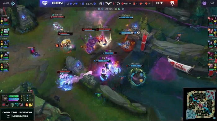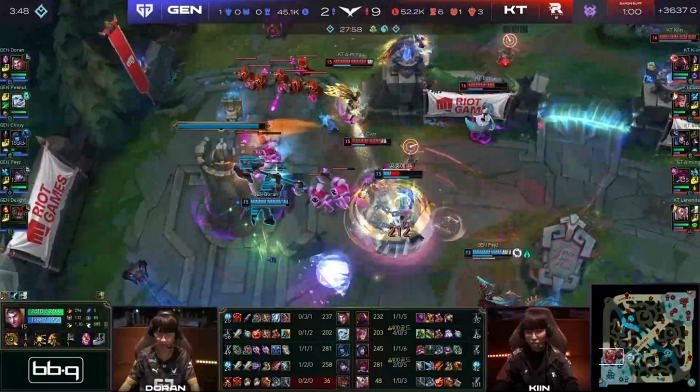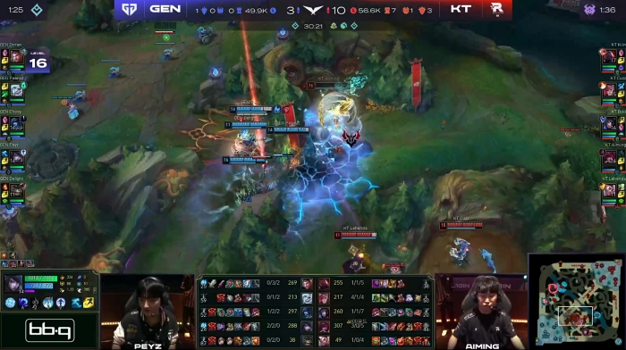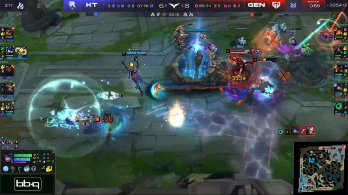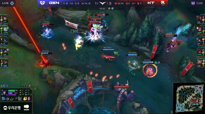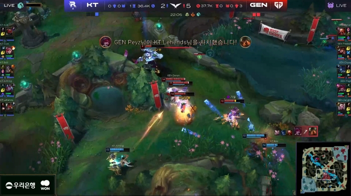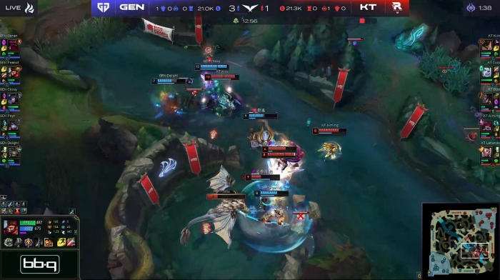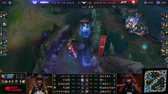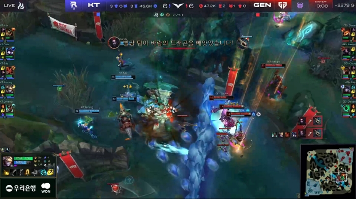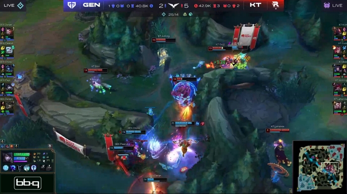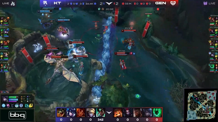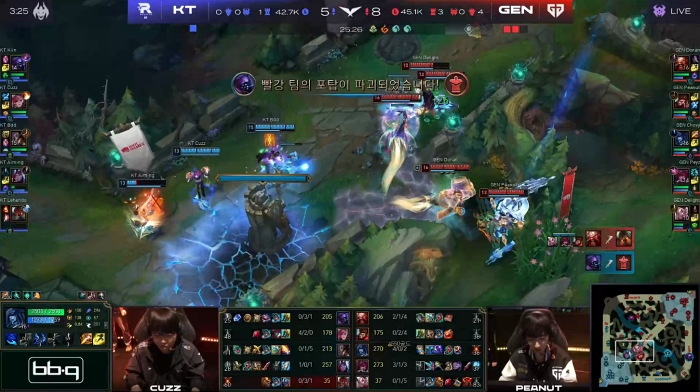 경기 시간 25분경 미드와 용 사이 대치 구도에서 KT의 비디디가 기습적으로 교전을 개시, 기인의 사이온이 중앙에서 굳건하게 버텨주며 양각 구도를 만들어내고 갈라진 젠지를 KT가 쓸어 담으며 한타를 대승한다.