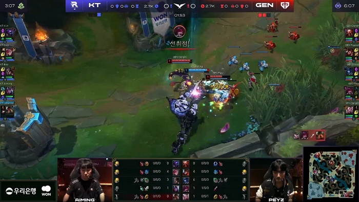 첫 선취점은 탑 라인에서 나왔다. KT의 기인이 계속해서 압박을 하다가 심리전으로 첫 킬을 올리고 연이어 바텀 라인에서 정글러만 개입한 젠지를 미드까지 합류한 KT가 킬을 올리며 기분 좋게 가져간다. 이에 맞서 젠지도 미드 라인에서 젠지의 쵸비 선수가 정글러와 함께 아리를 잡아내며 반격한다.