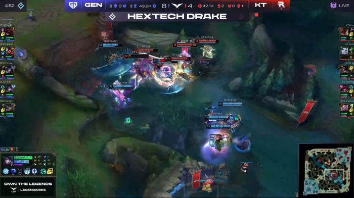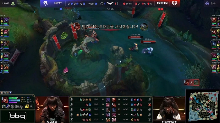 대치 상태를 유지하며 팽팽한 긴장감이 감도는 경기 상황, 야금 야금 전령도 먹고 용도 챙겨가며 슬금슬금 이득을 얻어 가던 KT가 세 번째 용을 두고 1분간의 대치 상황 속에서 빠르게 리산드라를 집중 공격, 이에 질세라 젠지도 사이온을 잘라내며 1:1 맞교환 후 KT가 정비하러 간 사이 젠지가 용을 가져갔다.