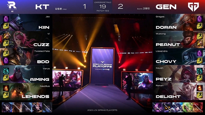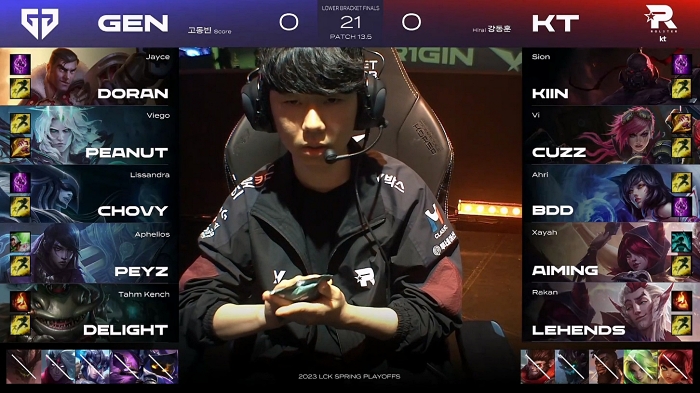 젠지는 제이스, 비에고, 리산드라, 아펠리오스, 탐 켄치를, KT는 사이온, 바이, 아리, 자야, 라칸을 선택했다. 젠지는 글로벌 밴이 풀린 비에고를 조커 카드로, KT는 아리-바이, 라칸-자야 등 페어로 활약하기 좋은 챔피언을 선택해 승부를 걸었다.