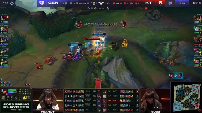 오공이 궁극기로 한번 돌기 시작하면 벌어지는 대참사를 알고 있기에 KT가 계속해서 소극적으로 임한다. 결국 경기 시간 25분경 용을 두고 젠지 피넛 선수의 잘 성장한 오공이 딜과 탱, CC기까지 모조리 다 해내며 한타를 대승, 경기의 무게추를 기울여버린다.
