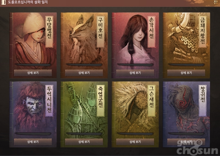 아침의 나라에선 초반 공통 이야기를 거치고 나면 옴니버스 방식으로 주요 퀘스트를 선택해 진행할 수 있다. 범에게 물려 죽은 귀신 '창귀전', 도깨비들의 왕 '두억시니전', 구미호전 등 한국 설화를 바탕으로 재현된 이야기를 게임 내에서 즐길 수 있다.