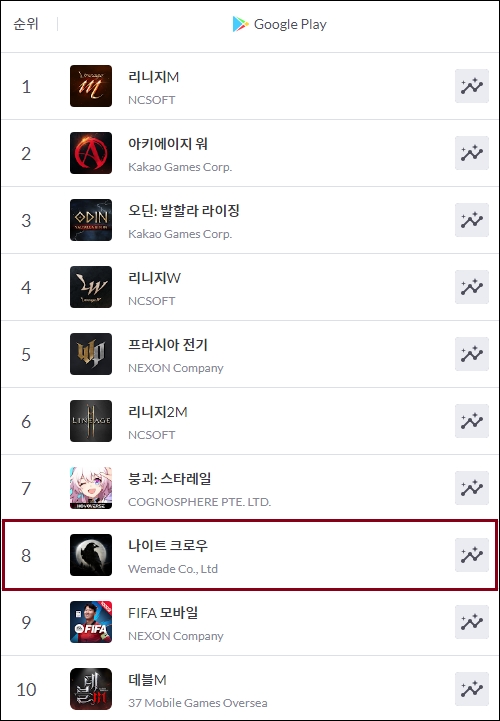 위메이드가 서비스하는 MMORPG '나이트 크로우'가 28일 구글 플레이 매출 순위 8위에 안착했다.