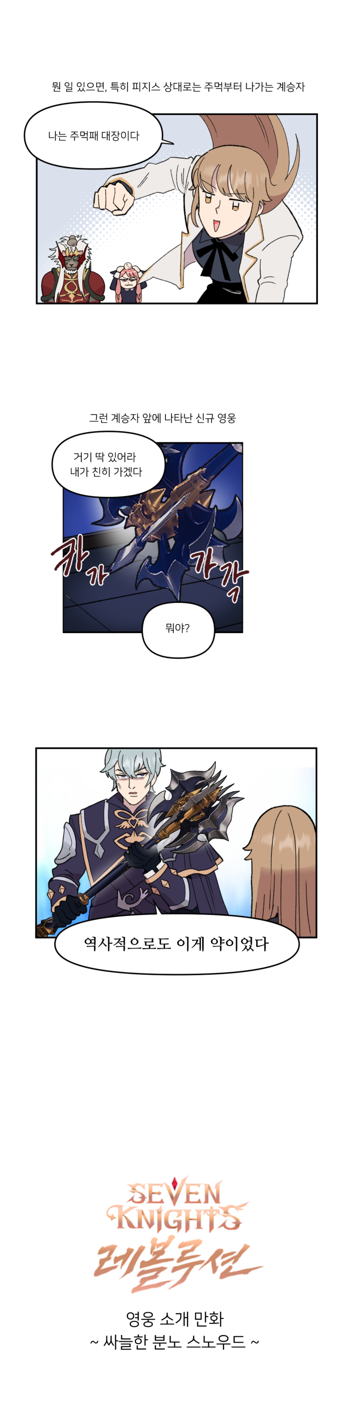 * 본 웹툰은 게임조선과 웹툰 작가 국도 님의 협업으로 제작되고 있으며, 넷마블의 세븐나이츠 레볼루션 공식 설정과 상이할 수 있습니다.
