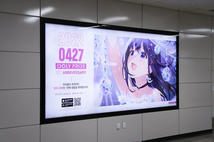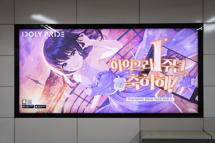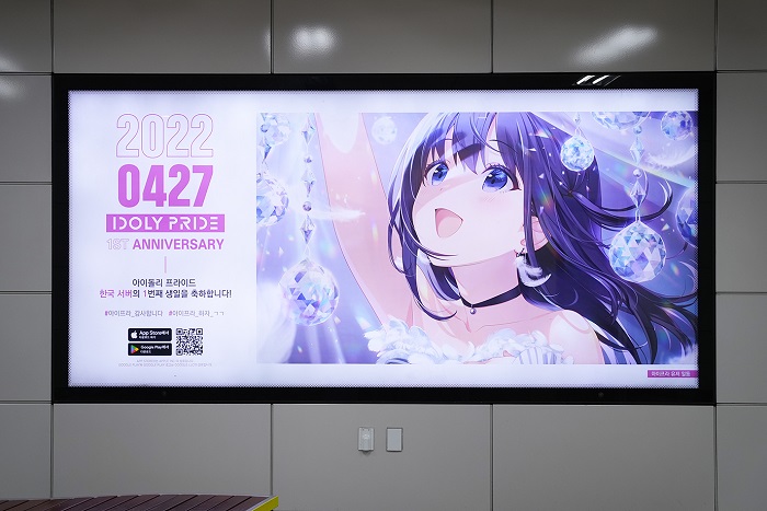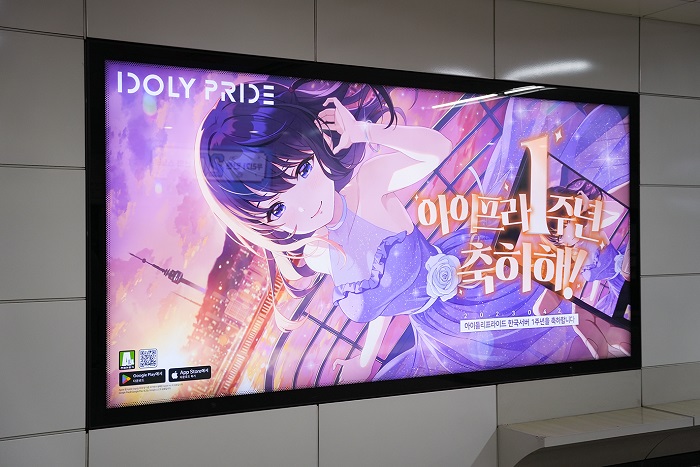 네오위즈 사옥이 위치한 분당구 인근의 지하철 판교역에 '아이돌리 프라이드' 출시 1주년을 축하하는 옥외 광고가 게재됐다. 이번 광고는 '아이돌리 프라이드' 이용자들의 자발적인 모금으로 진행됐으며, 생일 축하 멘트와 함께 게임 캐릭터 '나가세 마나'의 이미지 3편으로 구성됐다.