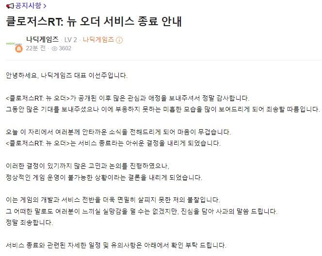 이선주 나딕게임즈 대표는 "그동안 많은 기대를 보내주셨으나 이에 부응하지 못하는 미흡한 모습을 많이 보여드리게 되어 죄송할 따름"이라며 "많은 고민과 논의를 진행했으나 정상적인 게임 운영이 불가능한 상황이라고 결론을 내리게 됐다"라고 전했다. 이어 "여러분이 느끼실 실망감을 덜 수는 없지만, 진심을 담아 사과의 말씀을 드린다"라고 전했다.