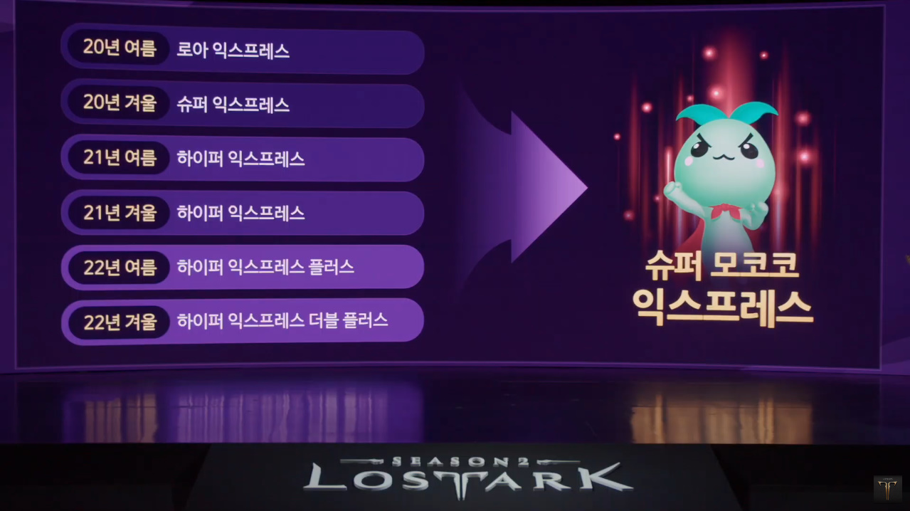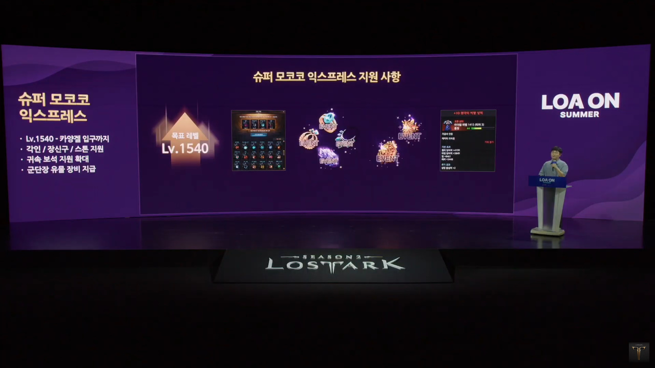 한편, 매 로아온에 공개했던 익스프레스 이벤트가 올해는 '슈퍼 모코코 익스프레스'로 돌아온다. 1540레벨까지 빠른 성장이 가능하며, 카양겔 노멀 난이도를 플레이할 수 있다. 1540달성 시 7레벨 보석을 지급하고 이후 꾸준한 플레이로 1580 달성 시 8레벨 보석을 지급한다. 익스프레스 캐릭터의 스킬, 장비, 보석, 각인을 간편하게 세팅할 수 있는 '전투 스타일 설정 지원' 시스템도 도입될 예정이다.