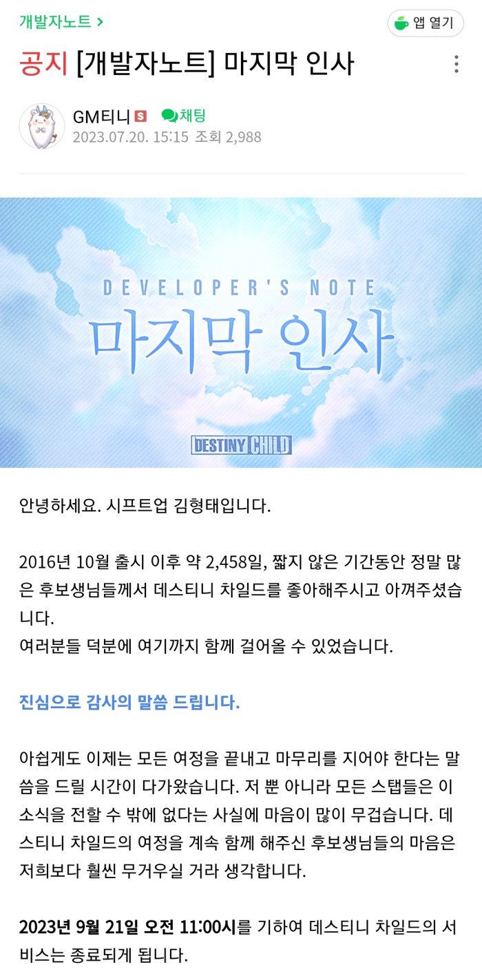 데스티니 차일드 서비스 종료를 발표한 시프트업 김형태 대표 = 데스티니 차일드 공식 카페 갈무리