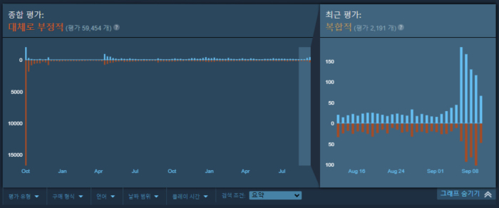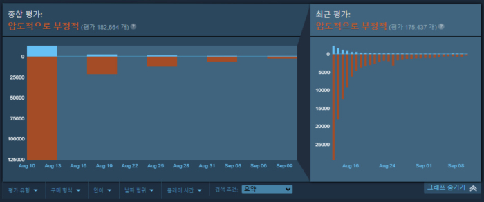 이에 많은 유저들이 PVE 개발을 위해 4년 동안 개발했다고 하면서 결국 내놓은 것은 아무것도 없다며 분통을 터뜨렸습니다. 배틀넷에선 이러한 의견이 가시적으로 보이지 않았지만, 스팀 입점으로 인해 압도적으로 부정적이라는 수치로 표현되었습니다.