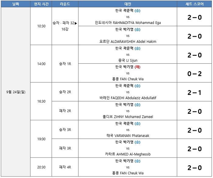 함께 출전한 한국 국가대표팀 박기영 선수는 패자조 4라운드에서 홍콩 대표 '판 처크 와(Fan Cheuk Wa)' 선수를 상대로 승리를 거두며 패자조 5~7라운드를 거쳐 결승 진출의 기회를 노릴 예정이다.