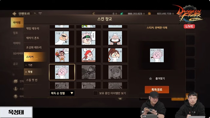 뒤틀린 은신처 영우 던전의 보상으로 추가되는 채팅 스티커 = 던파 모바일 드라이브 갈무리