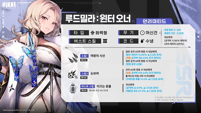 7일 업데이트를 통해 기간 한정 모집이 시작되는 '루드밀라: 윈터 오너'는 자신의 공격 능력을 향상시키면서 꾸준히 적에게 높은 피해를 줄 수 있는 딜러라는 점이 특징이다. 타입은 화력형이며 무기는 MG(머신건)을 사용하기에 지속 공격 능력이 매우 뛰어난 편이다. 버스트 스킬은 Ⅲ단계이며 코드는 수냉에 해당한다.