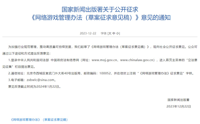 12월 22일 중국은 중화인민공화국 법무부 홈페이지를 통해 '온라인 게임 관리 방법' 초안을 공개했다. 30페이지에 달하는 해당 법률은 온라인 게임 관리를 강화하고 온라인 게임 산업의 질서를 표준화해 사용자의 권익을 보호, 특히 미성년자의 신체적 정신적 건강을 보장한다는데 초점을 맞췄다.