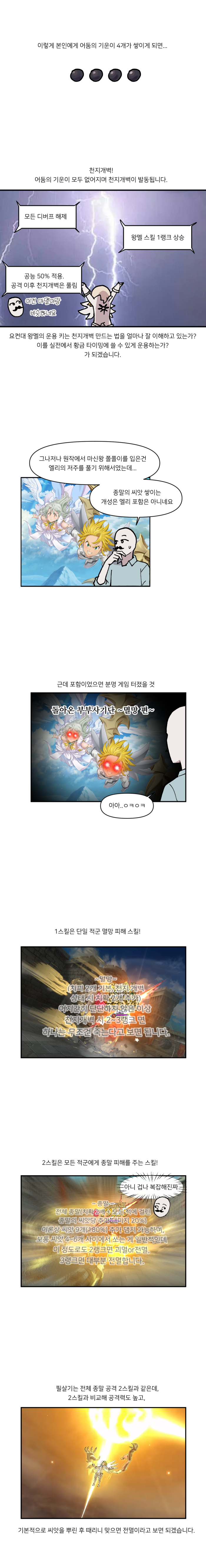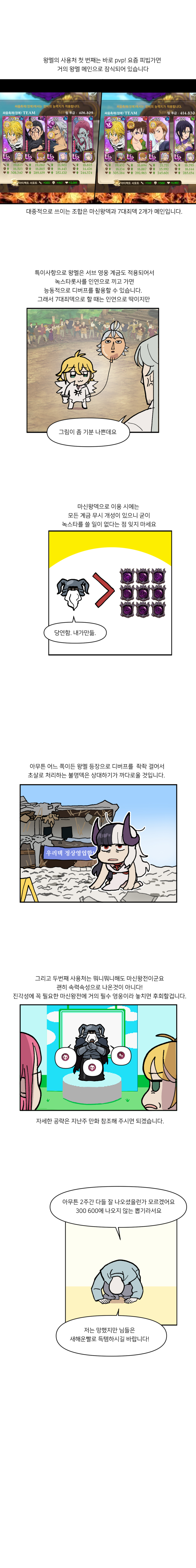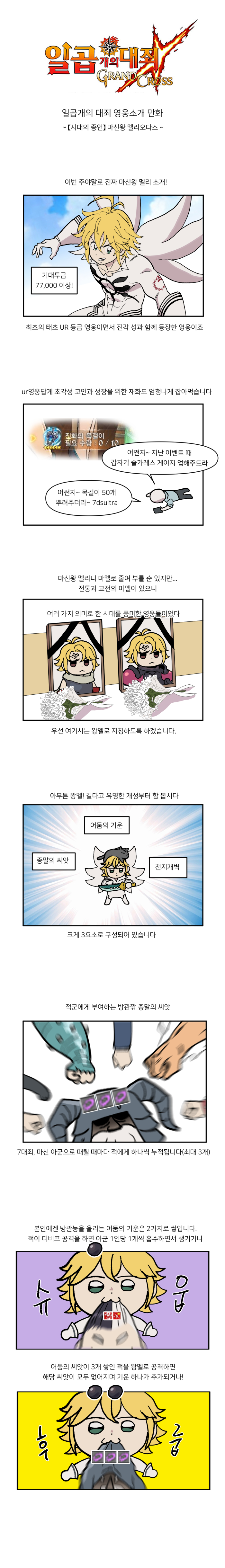 이번 작품은 지난 28일 등장한 신규 영웅 '[시대의 종언] 마신왕 멜리오다스(이하 마신왕멜리)' 마신왕멜리는 적에게 부여하는 종말의 씨앗, 자신에게 거는 어둠의 기운, 마지막으로 단발성 강력버프 천지개벽까지 3개의 능력이 대표적이다. 이 능력들은 결국 최상위 버프 천지개벽을 위해 서로 연계되도록 설계돼있는데다 그 과정이 다소 복잡해서 이해 여부에 따라 성능 차이가 극심한 것이 특징.