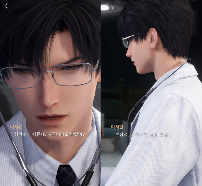 어쨋든 이서언은 주인공에게 청진기를 대보더니 대번에 상태가 안좋은 것을 알아낸다. 이런 상태인데도 전투에 꼭 나가야겠냐고 물어보는 말에는 퉁명스러움이 묻어나지만, 딱봐도 츤데레(싫다고 말하며 사실 챙겨주고 걱정하는 스타일의 애정) 성향이 뻔히 보인다. 솔직히 남자가 봐도 스윗~한 느낌이 느껴질 정도.