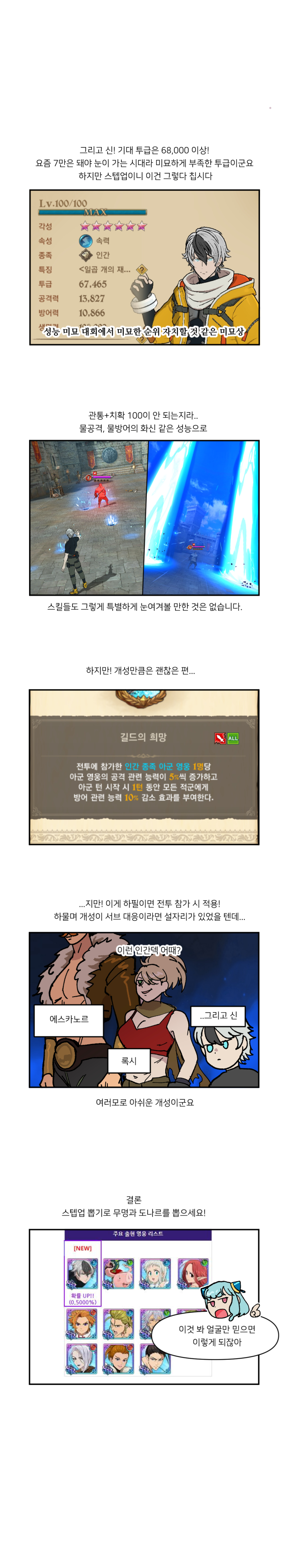 신의 경우 현재 상위 영웅들과 비교했을 때 객관적으로 낮은 성능이다. 특히 스텟이 크게 부족해 공방 모두 만족스로운 성능을 얻기는 어려운 영웅. 다만, 신의 경우 스탭업 뽑기로 등장해 비교적 얻기 쉽다는 점에서 낮은 성능에 대해 어느정도 납득이 가는 영웅이기도 하다.