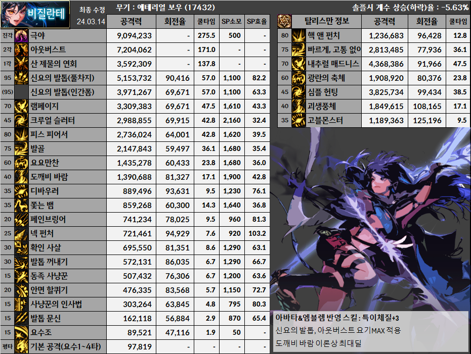 현재 많은 이용자들이 35제 스킬인 '디바우러', 75제 스킬인 '발골, 80제 스킬 '피스 피어서' 탈리스만을 사용하고 있다.