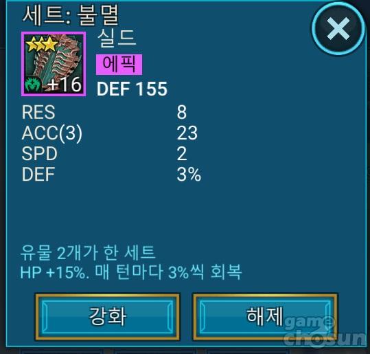 또한, 유물에는 HP 옵션과 HP% 옵션이 따로 붙는데, 고정 HP 옵션은 사용되지 않으며 HP% 옵션이 주로 사용된다. 다만, 투구에는 주옵으로 고정 DEF 옵션이 무조건 붙는다.